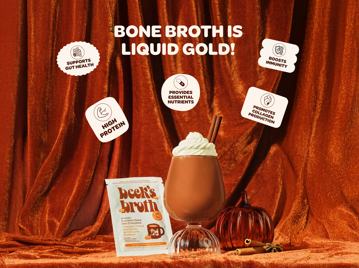 Say hello to your new cozy obsession! Protein Pumpkin Spice Hot Chocolate warms you up and fuels your gut with 15g of protein per cup. Our Protein Coffee keeps you fuelled and packs a chocolatey, nutty punch. And our Protein Salted Caramel Hot Chocolate? Pure indulgence that is here to cure cravings and help meet your protein goals. Enjoy all three flavours hot, iced, mixed into oatmeal, smoothies, or even your favourite fall baking! Stay nourished all season long with our nostalgic tasting bone broth drinks.