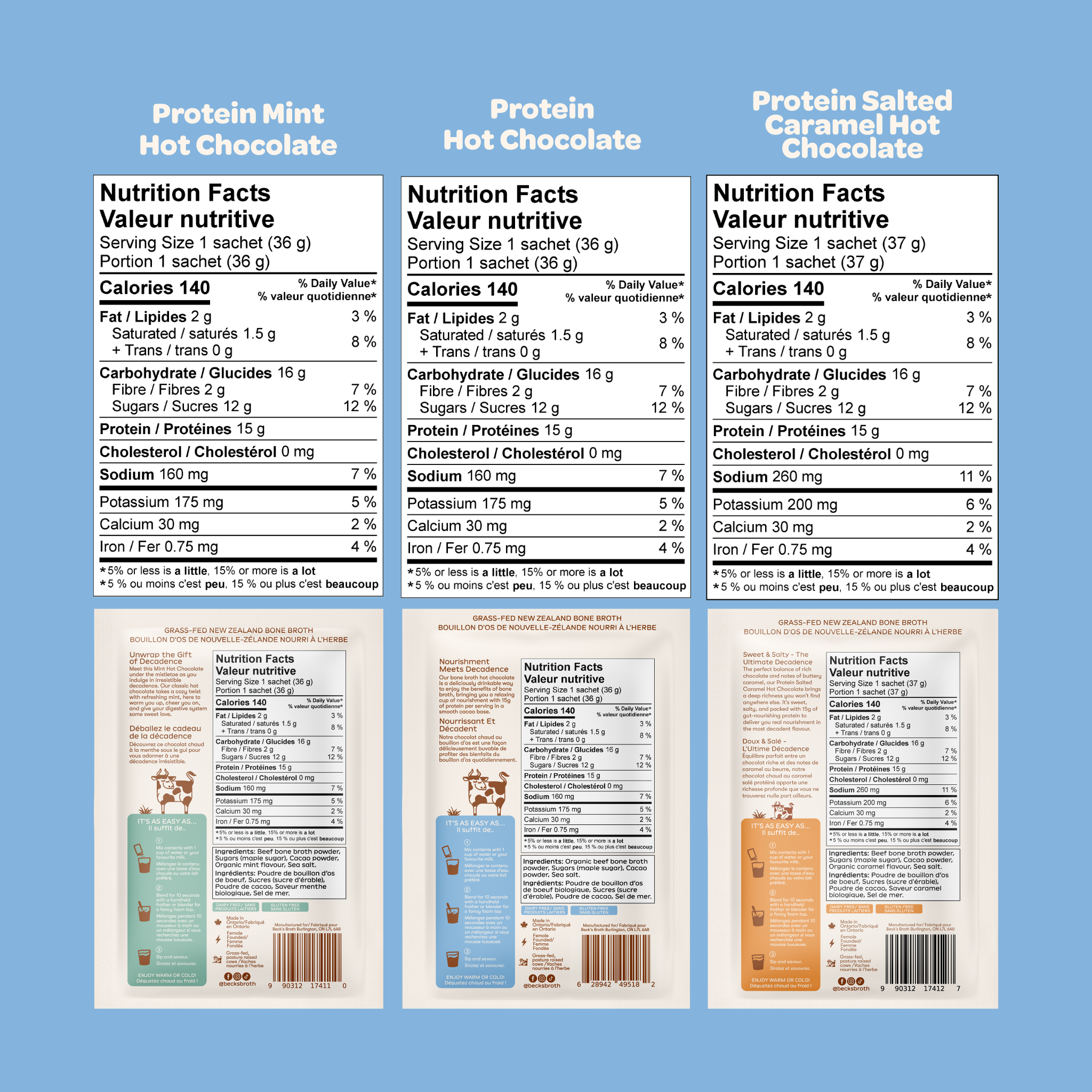 Give the gift of nourishment this season! Our Holiday Gift Set features three irresistible flavours: Protein Hot Chocolate, Protein Salted Caramel Hot Chocolate, and Protein Mint Hot Chocolate. Each cup delivers 15g of gut-loving protein to fuel your body while indulging your taste buds.